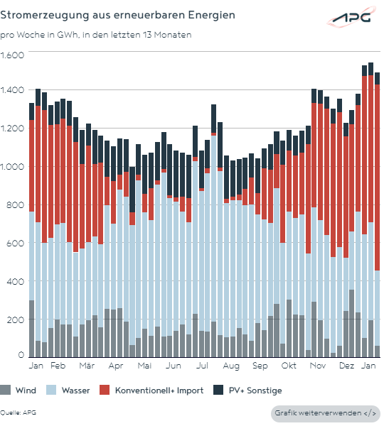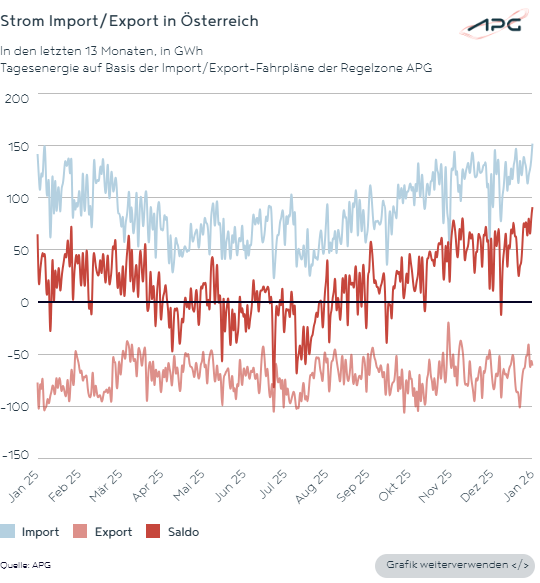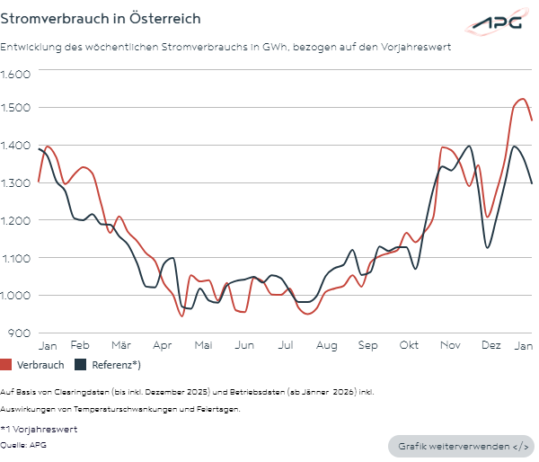 The first five weeks of 2026 were characterized by weather-related high electricity consumption and a sharp decline in renewable energy generation. As a result, Austria became a net importer of electricity in January. Demand could only be met through substantial electricity imports, the full deployment of available gas-fired power plants, and the increased use of pumped-storage facilities.