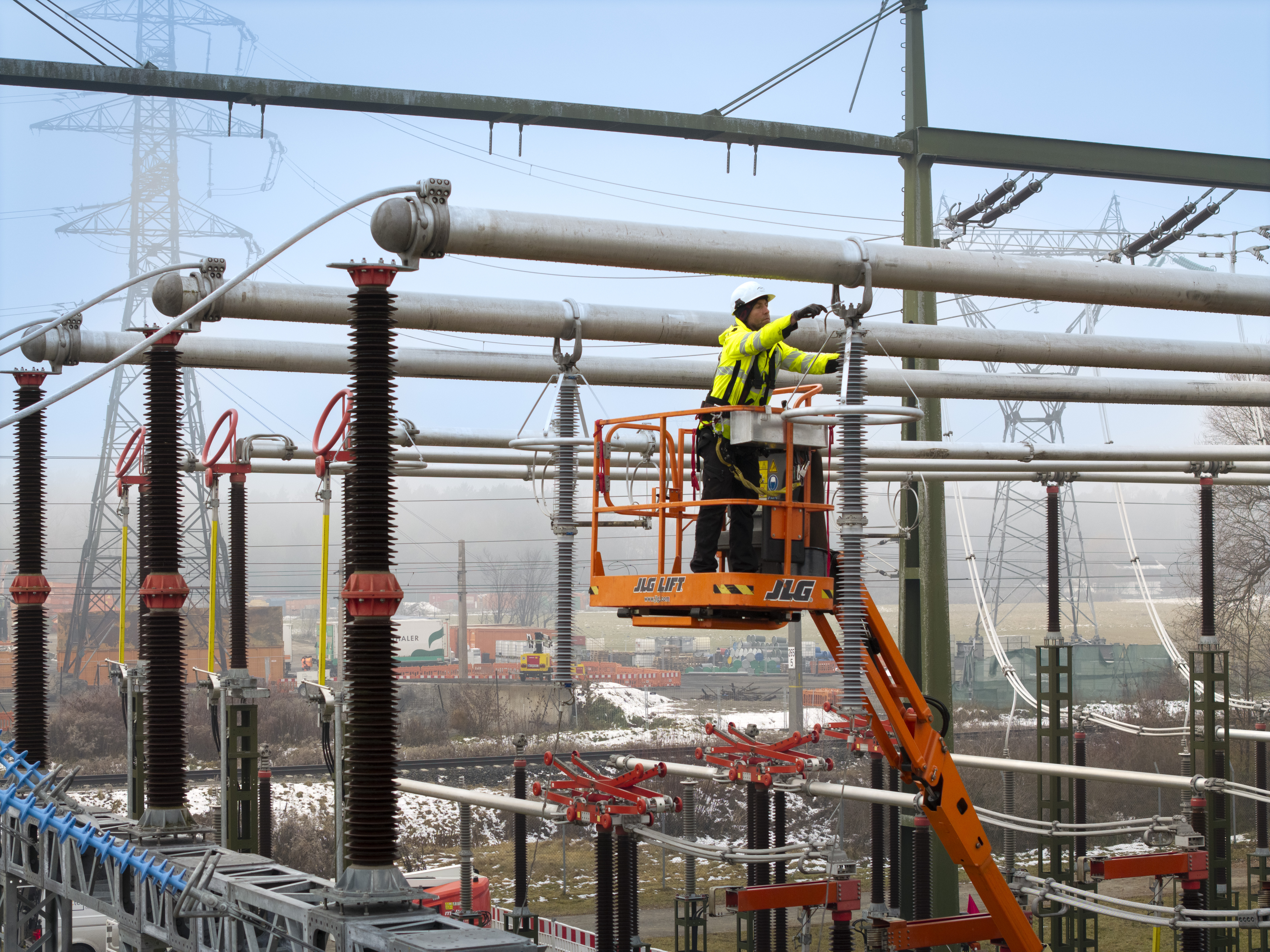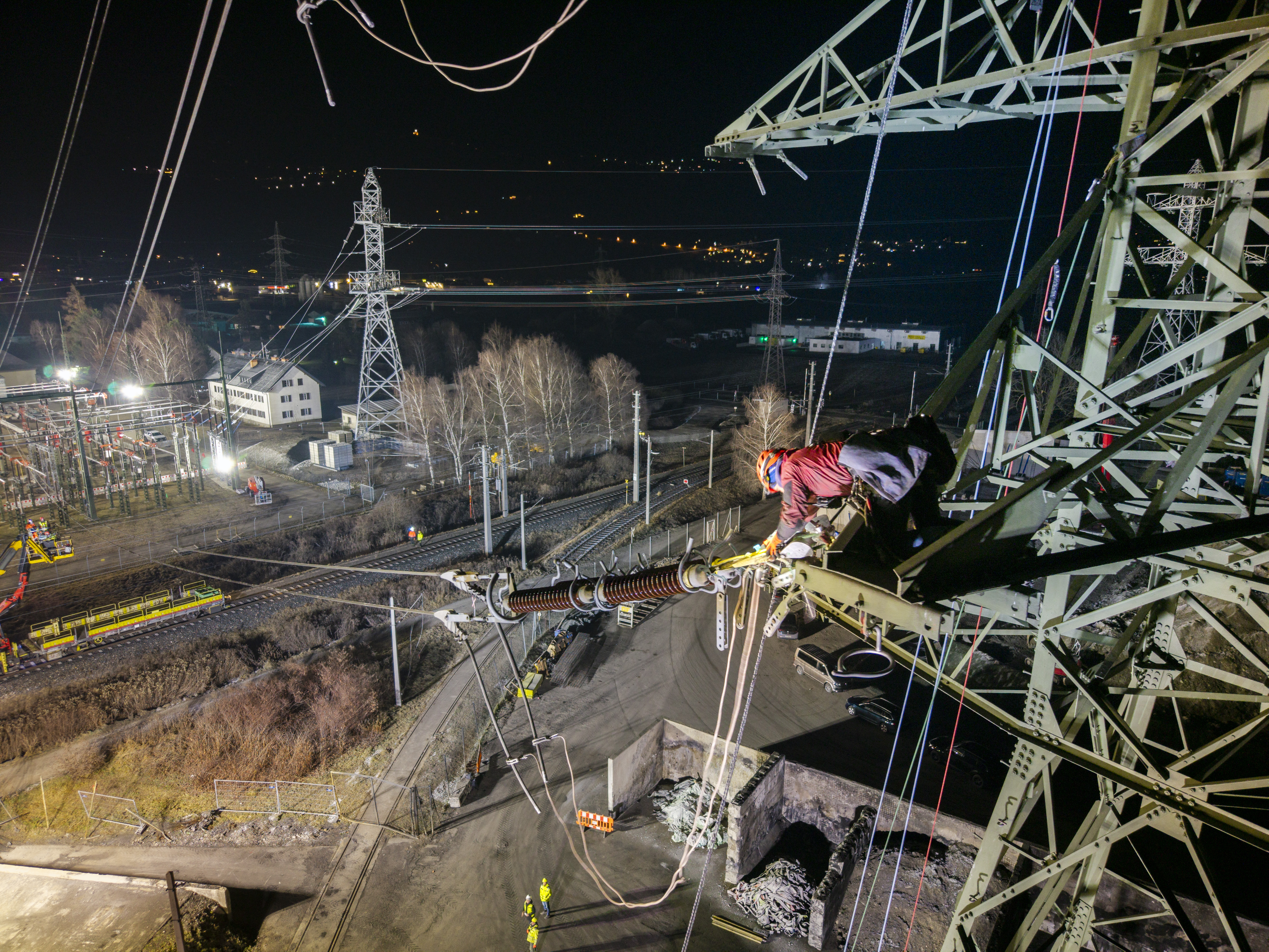 Construction of the temporary power line began in September 2025. Four temporary pylon sites were prepared, followed by the erection of the pylons and the installation of approximately 1.2 kilometers of new 220 kV transmission lines. The delivery of the temporary pylons alone was a logistical feat: 70 semi-trailer trucks transported a total of 870 tons of material to Lienz. The pylons were pre-assembled on the ground and then erected using mobile cranes.
