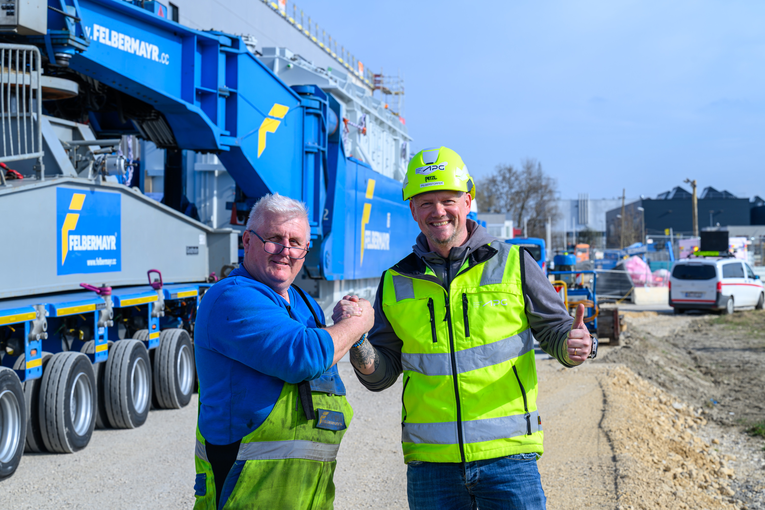 Teamarbeit beim Trafotransport in das UW Pichling: Karl Dobermaier (Felbermayr) & Jürgen Pilgerstorfer (APG-Projektleiter Umspannwerke)