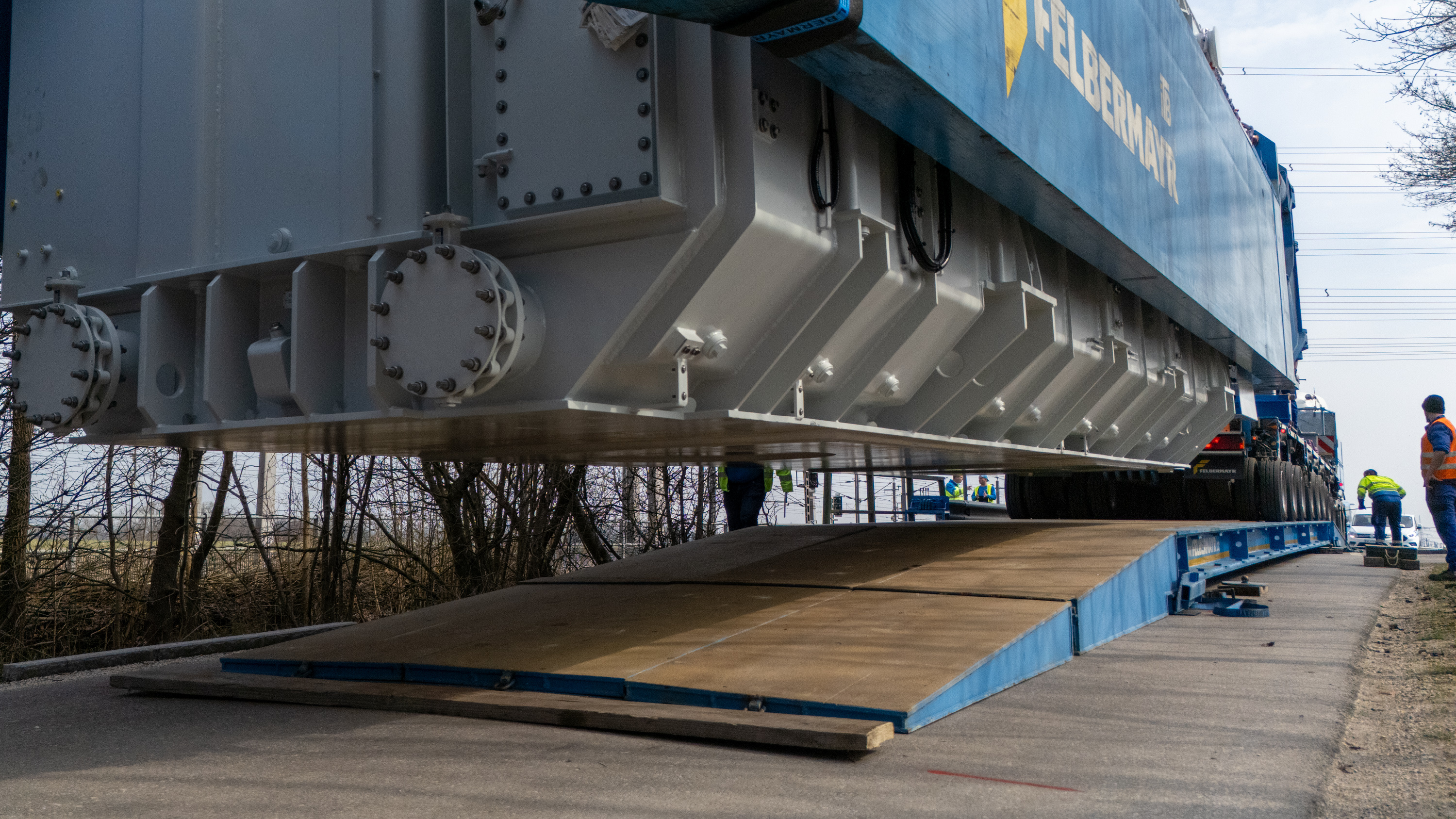 Die Fahrstrecke zum Umspannwerk Pichling stellte das Transportteam vor mehrere technisch anspruchsvolle Herausforderungen. Für den Transport über die Tagerbachbrücke war die Errichtung eines sogenannten Fly‑Overs notwendig – eine temporäre, stabile Überbauung, die das Brückenbauwerk entlastet und die sichere Passage des 272‑Tonnen‑Kolosses ermöglicht. Auch Verkehrsschilder und Straßenlaternen mussten vorübergehend abgebaut werden.