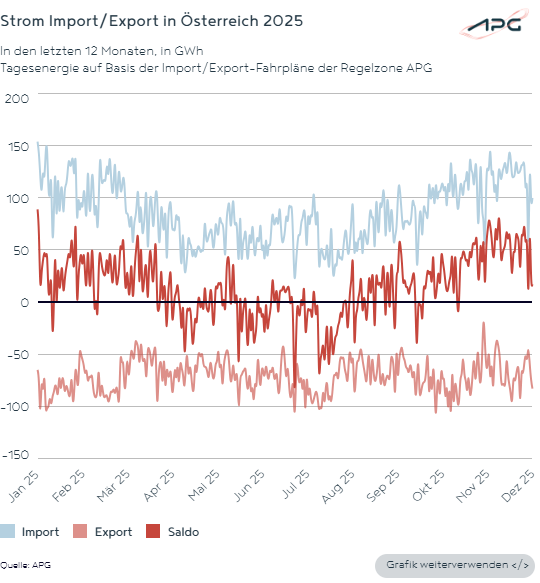Erzielte Österreich im Jahr 2024 – unter anderem dank hoher Erträge aus der Laufwasserkraft – auf Basis der Fahrpläne per Saldo einen Rekord-Jahres-Export in der Höhe von 4.747 GWh und war nach 14 Jahren erstmals wieder Strom-Exportland, so sah sich Österreich 2025 erneut mit einer ausgesprochenen Import-Abhängigkeit konfrontiert.