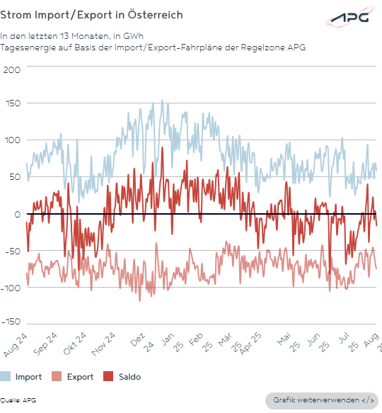 Im August 2025 stellte sich der Energieaustausch innerhalb Österreichs wie folgt dar: In Niederösterreich (361 GWh) und in Tirol (297 GWh) wurden die höchsten Energiemengen in das APG-Netz eingespeist und damit österreichweit zur Verfügung gestellt. Von Wien (480 GWh) und Kärnten (179 GWh) wurde der meiste Strom aus dem APG-Netz bezogen.