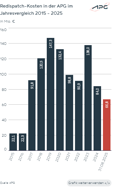 Insgesamt waren bisher an 125 Tagen (Vergleich: 123 Tage bis Ende August im Jahr 2024) Eingriffe notwendig. Durch diese Redispatch-Maßnahmen entstanden bis Ende August 2025 Kosten in der Höhe von 66,8 Millionen Euro (plus 5,2 Millionen zum Vorjahres-August).