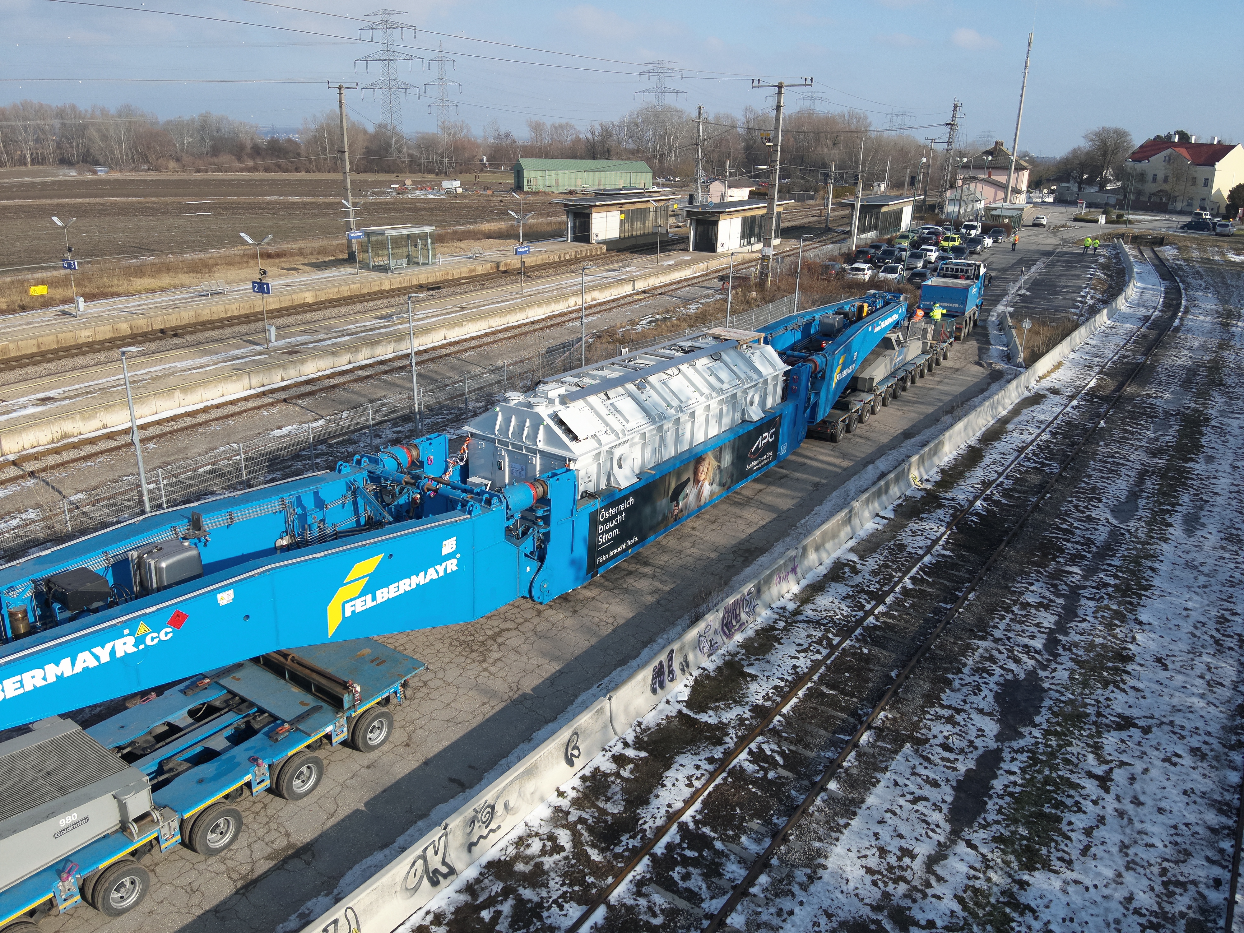 Seit vergangener Woche steht der zweite 380/110-kV-Großtransformator im Umspannwerk Sarasdorf nahe Bruck an der Leitha (NÖ). Der 289 Tonnen schwere Stahlkoloss wurde am Bahnhof Götzendorf für die letzte Etappe via Straßentransport verladen und mithilfe zweier Fahrzeuge - vorne eines zum Ziehen, hinten eines zum Schieben - innerhalb von rund zwei Stunden geliefert.
