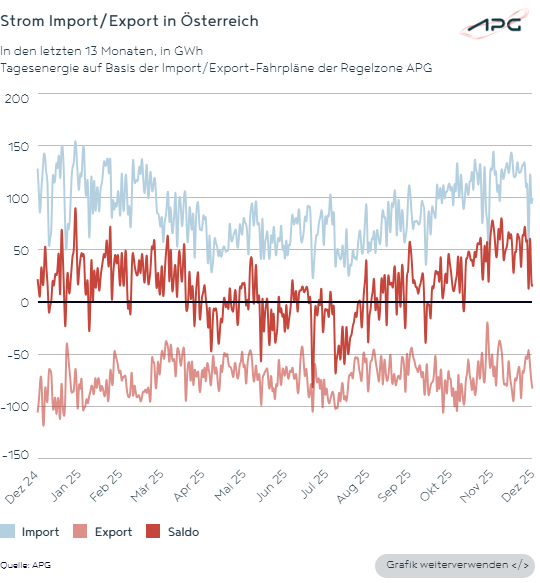 Mit Hilfe eines kapazitätsstarken Übertragungsnetzes können Stromüberschüsse der einzelnen Bundesländer österreichweit verteilt und somit Defizite kompensiert werden. Im Dezember 2025 zeichnete sich im Energieaustausch innerhalb Österreichs folgendes Bild: In Vorarlberg (285 GWh) und im Burgenland (104 GWh) wurden die höchsten Energiemengen in das APG-Netz eingespeist und damit österreichweit zur Verfügung gestellt. Von Niederösterreich (460 GWh) und Salzburg (280 GWh) wurde der meiste Strom aus dem APG-Netz bezogen.