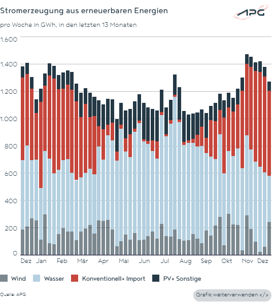 In den Dezember-Wochen (KW 49-52) reduzierte sich die erneuerbare Erzeugung (2.809 GWh) um 13,5 Prozent zum Dezember 2024 (3.247 GWh).