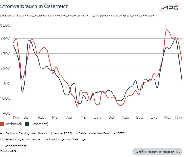 Ein weiterer Grund für die Import-Abhängigkeit liegt im gestiegenen Stromverbrauch: Auf Basis der aktuellen Daten wurden im Dezember in Österreich 5.433 GWh Strom aus dem öffentlichen Netz bezogen** – dies entspricht einer Erhöhung um rund 5,0 Prozent gegenüber Dezember 2024 (5.175 GWh).