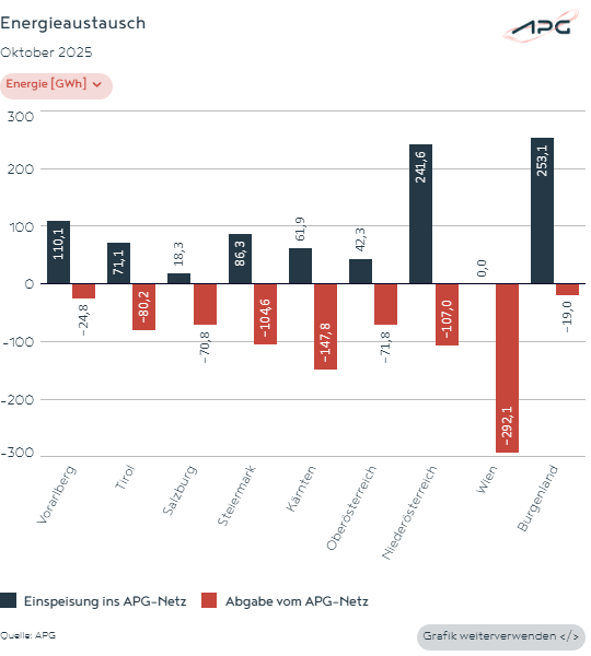 Im Oktober 2025 stellte sich die Lage im Energieaustausch innerhalb Österreichs folgendermaßen dar: Im Burgenland (253 GWh) und in Niederösterreich (242 GWh) wurden die höchsten Energiemengen in das APG-Netz eingespeist und damit österreichweit zur Verfügung gestellt. Von Wien (292 GWh) und Kärnten (148 GWh) wurde der meiste Strom aus dem APG-Netz bezogen.