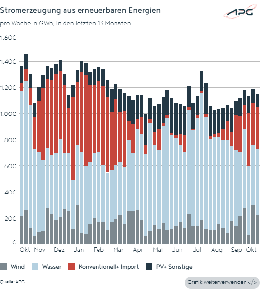 Bei der Windenergie und der Photovoltaik zeichnete sich ein anderes Bild: Die Einspeisung von Wind stieg im Vorjahresvergleich um 35,4 Prozent an und auch die PV-Einspeisung erhöhte sich gegenüber dem Oktober 2024, konkret um 8,2 Prozent. Dies kompensierte allerdings nicht den Rückgang bei der Wasserkraft, die den Löwenanteil der Erneuerbaren bildet.
