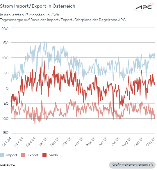 Im Vergleich zum Vorjahresmonat stellte sich die „Produktionslage“ im Oktober 2025 gänzlich anders dar: Während Österreich im Oktober des Vorjahres mit einem Export von 904 GWh Export-Land war und an 29 Tagen bilanziell Strom ins Ausland exportieren konnte, ergab sich über den Gesamtmonat Oktober des laufenden Jahres in Österreich (Regelzone APG*) per Saldo ein Import in der Höhe von 476 GWh (jeweils auf Basis der Fahrpläne), wobei lediglich an sechs Tagen ein bilanzieller Stromexport verzeichnet wurde.