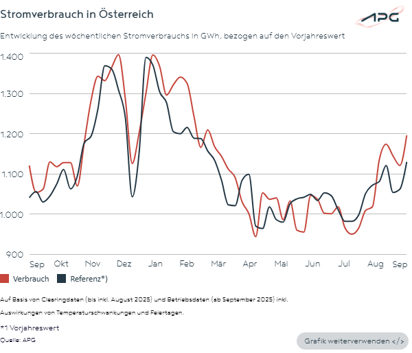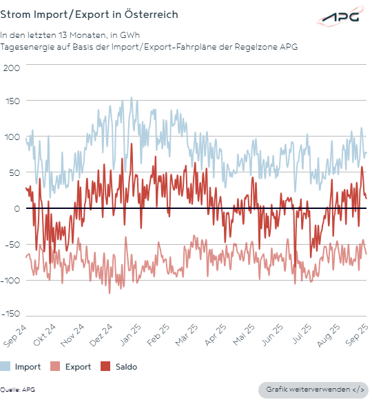 Die Rückgänge hinsichtlich der erneuerbaren Produktion schlugen sich im September in einer entsprechenden Import-Notwendigkeit nieder: Während im September 2024 an 16 Tagen bilanziell Strom ins Ausland exportiert werden konnte und ein Export-Saldo in der Höhe von 232 GWh erzielt wurde, war Österreich im September 2025 Stromimportland. Per Saldo ergab sich über den Gesamtmonat September 2025 gesehen in Österreich (Regelzone APG*) ein Import in der Höhe von 511 GWh (auf Basis der Fahrpläne), wobei an nur 5 Tagen bilanziell Strom ins Ausland exportiert werden konnte.