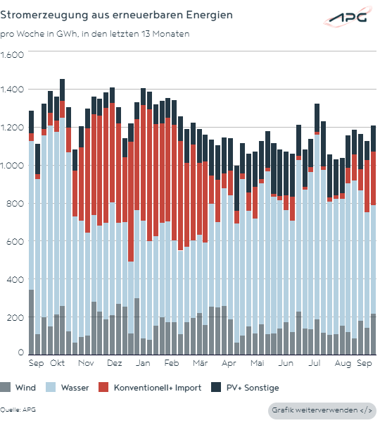 Sowohl die Produktion aus Windkraft und Photovoltaik als auch jene aus Wasserkraft sind im September aufgrund der Wetterlage in Österreich absolut gesehen gesunken. Besonders stark fiel der absolute Produktionsrückgang mit 32,3 Prozent gegenüber dem Vorjahresmonat bei der Windenergie aus. Insgesamt reduzierte sich die gesamte erneuerbare Erzeugung (4.026 GWh) um 10,9 Prozent zum September des Vorjahres (4.520 GWh).