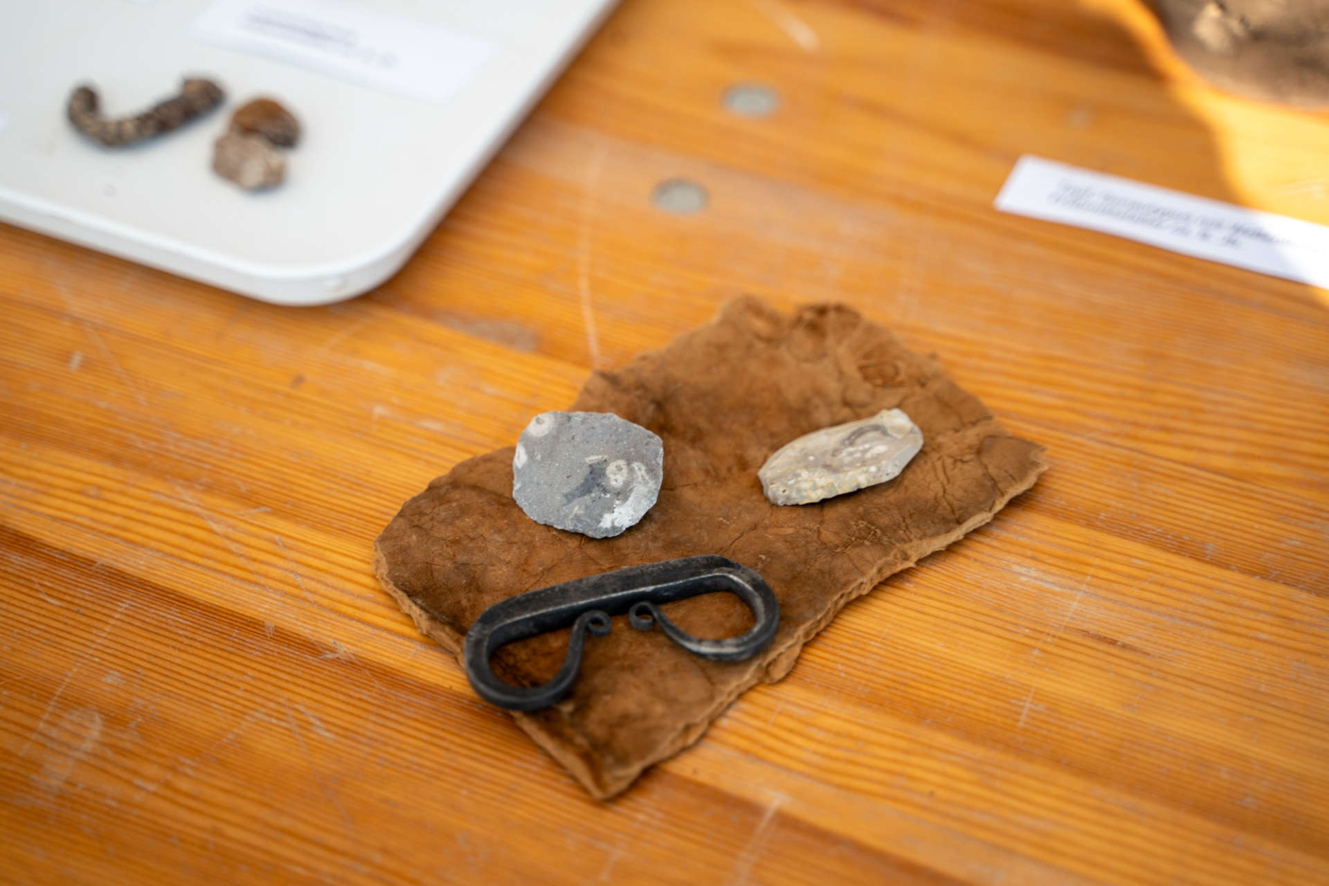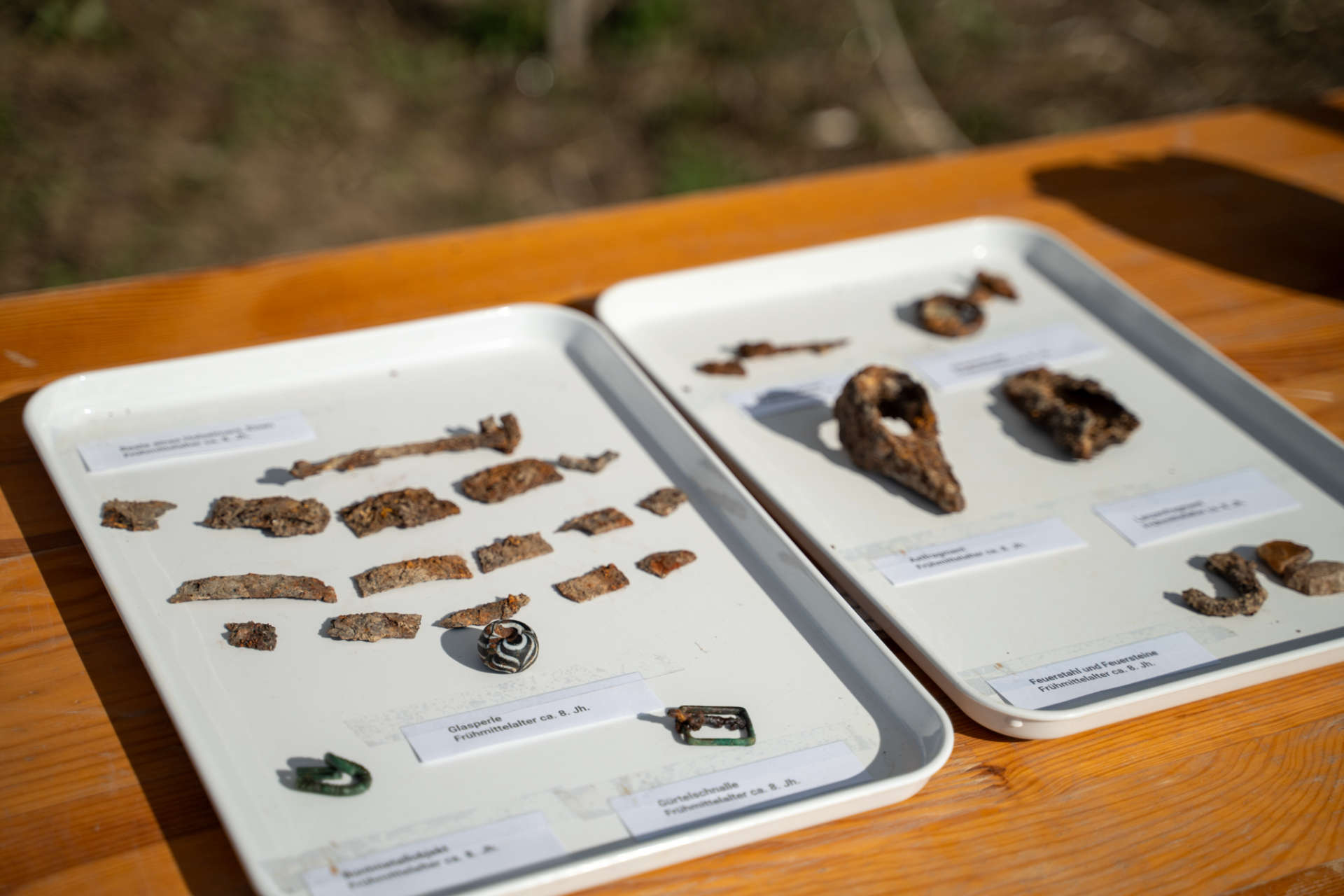 - Ein Topf mit wellenlinienförmiger Verzierung wird dem sogenannten Donautypus zugeordnet, der in unserer Region ab dem 8. und 9. Jahrhundert beliebt war. Auch Alltagsgegenstände fanden ihren Platz. Mit einem Feuerstahl und Feuersteinen ließ sich einfach ein Feuer entzünden. Ein eiserner Bügel sowie längliche Eisenfragmente zeigen die Reste eines kleinen Holzeimers. In mehreren Gräbern wurden auch Bruchstücke von Messern gefunden.